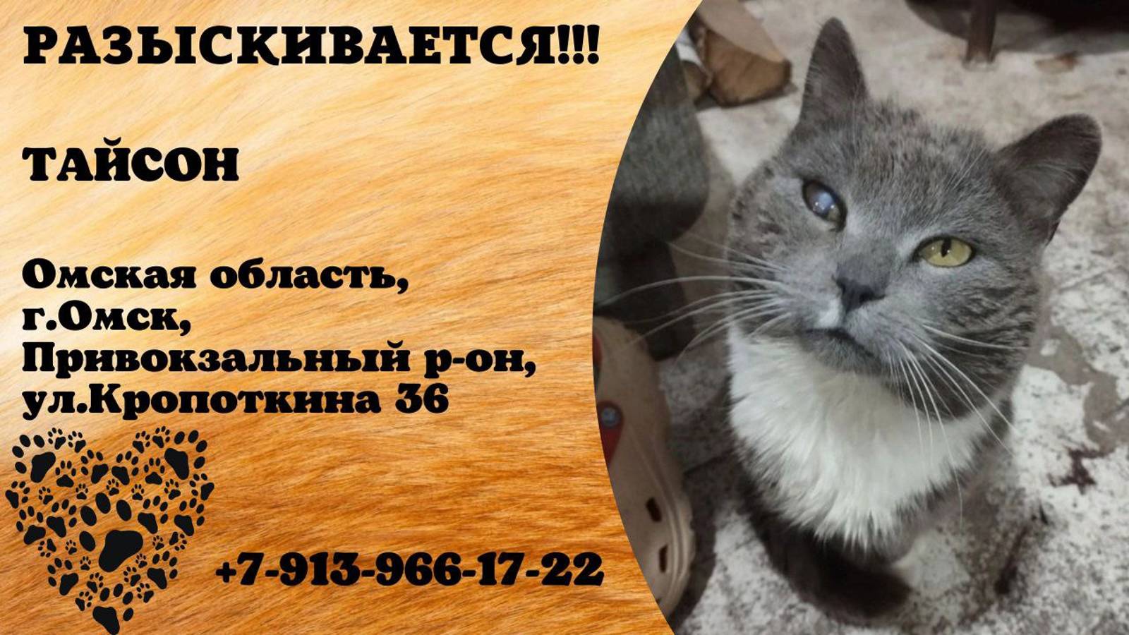 Омская Омск Пропал кот 24.09 Потерялся кот зовут Тайсон потерялся 2 дня назад в привокзальном районе, ул.Кропоткина 36. Кто видел нашёл или знает о его месте нахождения сообщите по номеру 89139661722 звоните в любое время. Кот взрослый крупный один глаз не видит на имя отзывается. За возвращение котика домой гарантированно вознаграждение. Инфо https://vk.com/wall-198815410_154522