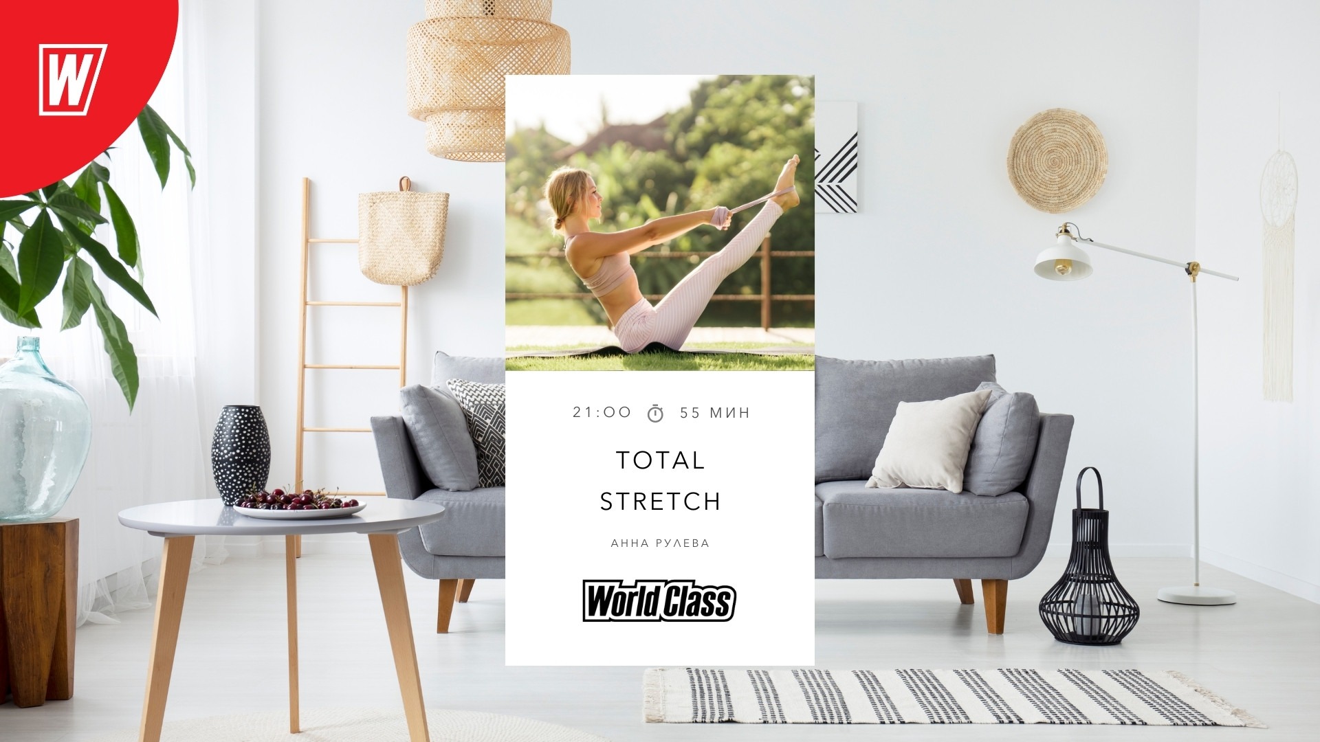 TOTAL STRETCH — основательная тренировка на растяжку: улучшает гибкость, снимает мышечное напряжение, стресс и дарит чувство глубокого расслабления. Анна Рулева - элит-тренер групповых программ World Class Red Side. Сертифицированный тренер Les Mills. Расписание онлайн-тренировок смотрите в нашем телеграм-канале https://t.me/worldclassfit Хотите заниматься в клубах World Class по особой цене? Следите за спецпредложениями на http://bit.ly/yt_special А если хочется тренироваться онлайн персонально под присмотром тренера, записывайтесь на тренировку: https://www.worldclass.ru/online-personal/ Наши страницы в социальных сетях: Telegram — https://t.me/worldclassfit Вконтакте — http://vk.com/worldclassclubs TikTok — http://tiktok.com/@worldclassclubs Яндекс Дзен — https://zen.yandex.ru/worldclassmag Слушайте наш подкаст о фитнесе, правильном питании и всём, что входит в здоровый образ жизни: Яндекс Музыка https://music.yandex.ru/album/12506344 Apple Podcasts https://podcasts.apple.com/ru/podcast/world-class-magazine/id1536484071 Castbox https://castbox.fm/channel/id3439173
