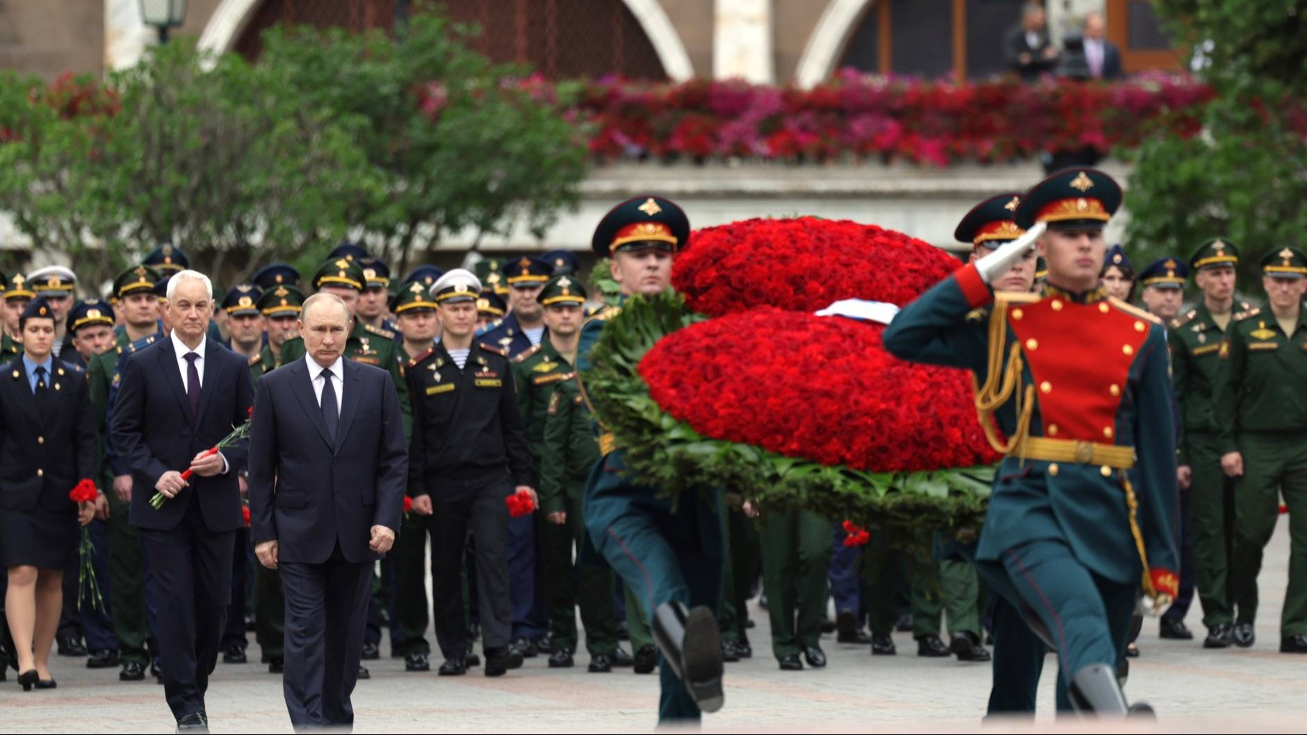 Президент почтил память погибших в боях против немецко-фашистских захватчиков. В 84-ю годовщину начала Великой Отечественной войны глава государства возложил венок к Могиле Неизвестного Солдата у Кремлёвской стены. Церемония прошла в Александровском саду, в ней приняли участие ветераны боевых действий, военнослужащие, выпускники военных вузов. Цветы к Вечному огню также возложил Министр обороны Андрей Белоусов. Участники почтили память защитников Отечества минутой молчания. Мероприятие продолжилось торжественным маршем роты почётного караула и оркестра перед общенациональным мемориалом воинской славы. Президент также возложил цветы к обелискам городов-героев и памятному знаку в честь городов, удостоенных почётного звания «Город воинской славы». * * * День памяти и скорби – день начала Великой Отечественной войны. 22 июня 1941 года нацистская Германия без объявления войны напала на Советский Союз. Источник: http://kremlin.ru/events/president/news/77232 #новости #Россия #Москва #Кремль #Путин #Белоусов #история #ВОВ #солдат #память #Победа #фашизм #нацизм #неонацизм #политика #общество