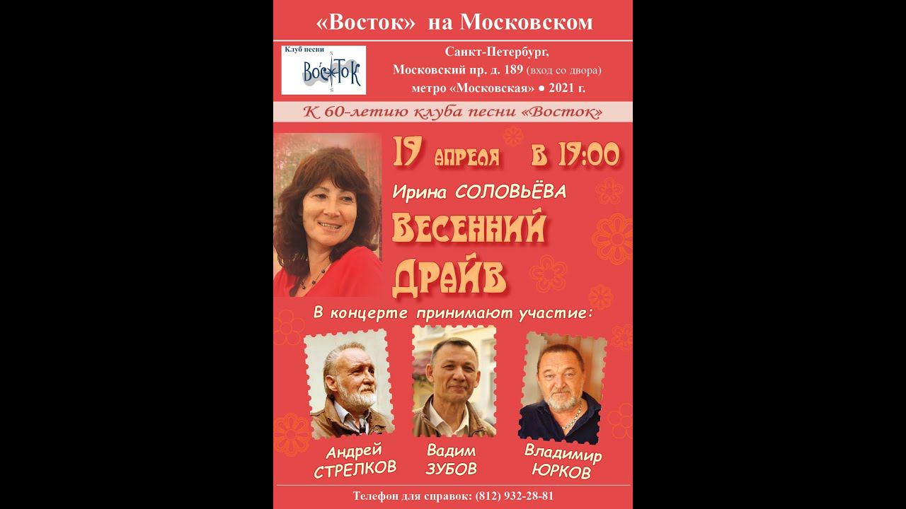 Ирина Соловьёва, Андрей Стрелков, Вадим Зубов и Владимир Юрков. «Весенний драйв». Клуб песни «Восток». 19 апреля 2021 г. Санкт-Петербург, Московский пр., д. 189. Видеозапись - Алла Левитан. Запись и обработка звука - Геннадий Демин. Ведущий - Андрей Стрелков. 0:03:50 Ирина Соловьёва 0:34:24 Андрей Стрелков 1:06:45 Вадим Зубов 1:40:41 Владимир Юрков
