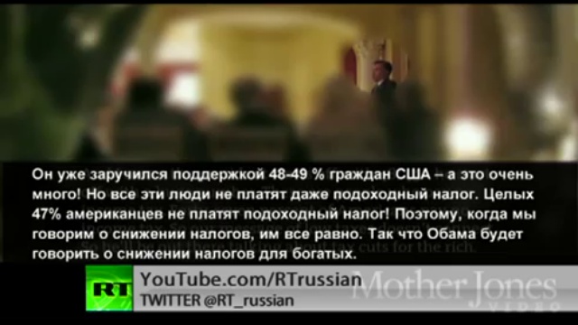 Эти кадры были сделаны на закрытом мероприятии по сбору средств на предвыборную кампанию Ромни. Кандидат в президенты США назвал половину американцев дармоедами, утверждая, что «47% граждан, которые поддерживают Обаму, зависят от правительства и считают себя жертвами, о которых власти должны заботиться».