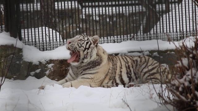 Бенгальский тигрёнок Кови отдыхает на снегу 04.12.2024