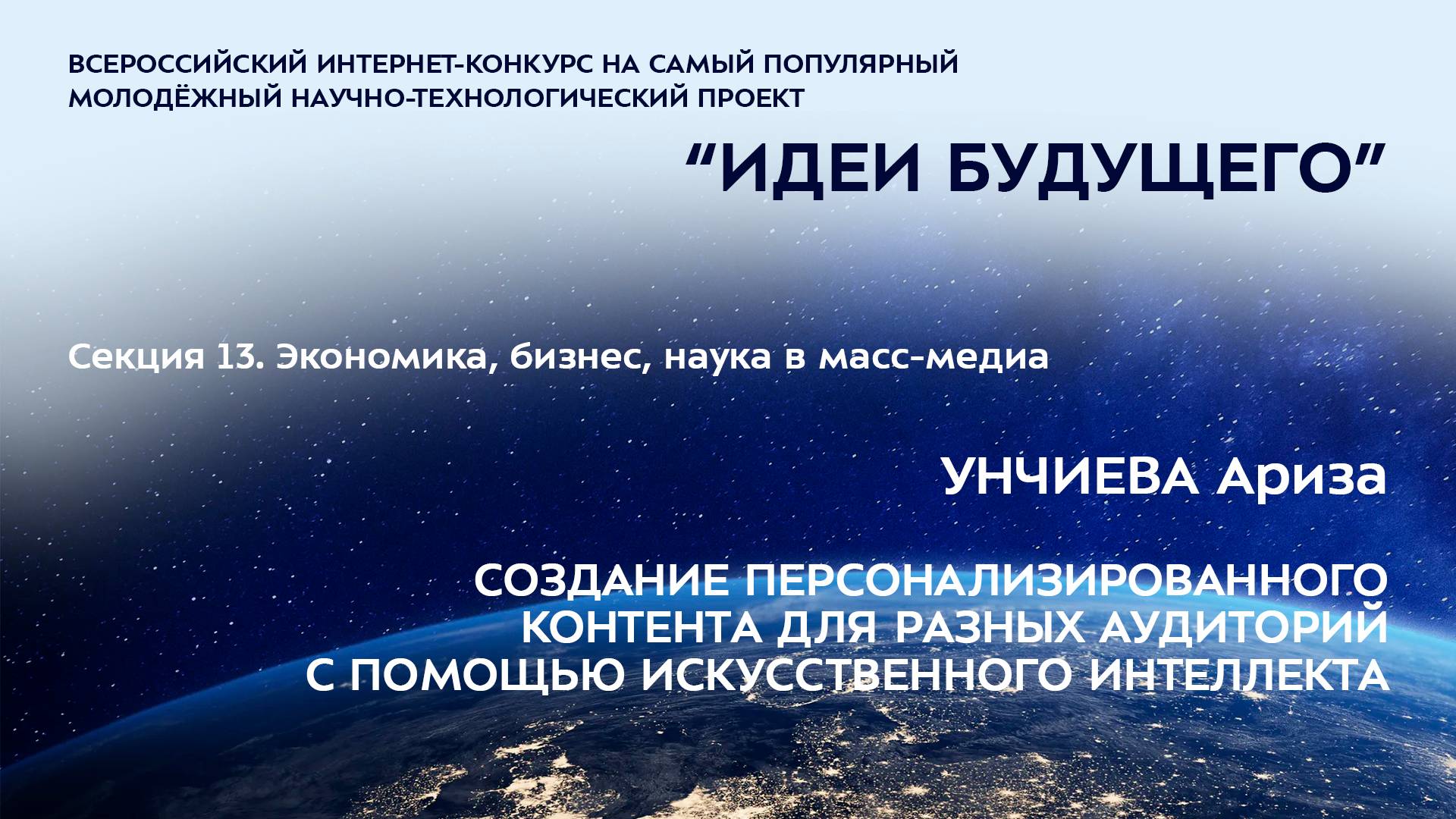 (13-10) УНЧИЕВА Ариза Ахмедовна Республика Дагестан, г. Махачкала МБОУ «Гимназия № 13», 10 класс СОЗДАНИЕ ПЕРСОНАЛИЗИРОВАННОГО КОНТЕНТА ДЛЯ РАЗНЫХ АУДИТОРИЙ С ПОМОЩЬЮ ИСКУССТВЕННОГО ИНТЕЛЛЕКТА Научные руководители: Ахмедова Гурият Яхьяевна, Республика Дагестан, г. Махачкала, МБОУ «Гимназия №13», учитель русского языка и литературы, Омарова Аминат Багировна, Республика Дагестан, г. Махачкала, АО «Информационное агентство Интерфакс», менеджер по маркетингу Более подробно о мероприятиях Программы "Шаг в будущее" можно узнать на сайтах http://www.step-into-the-future.ru/ и http://шагвбудущее.рф Мероприятия проводятся при поддержке Фонда президентских грантов