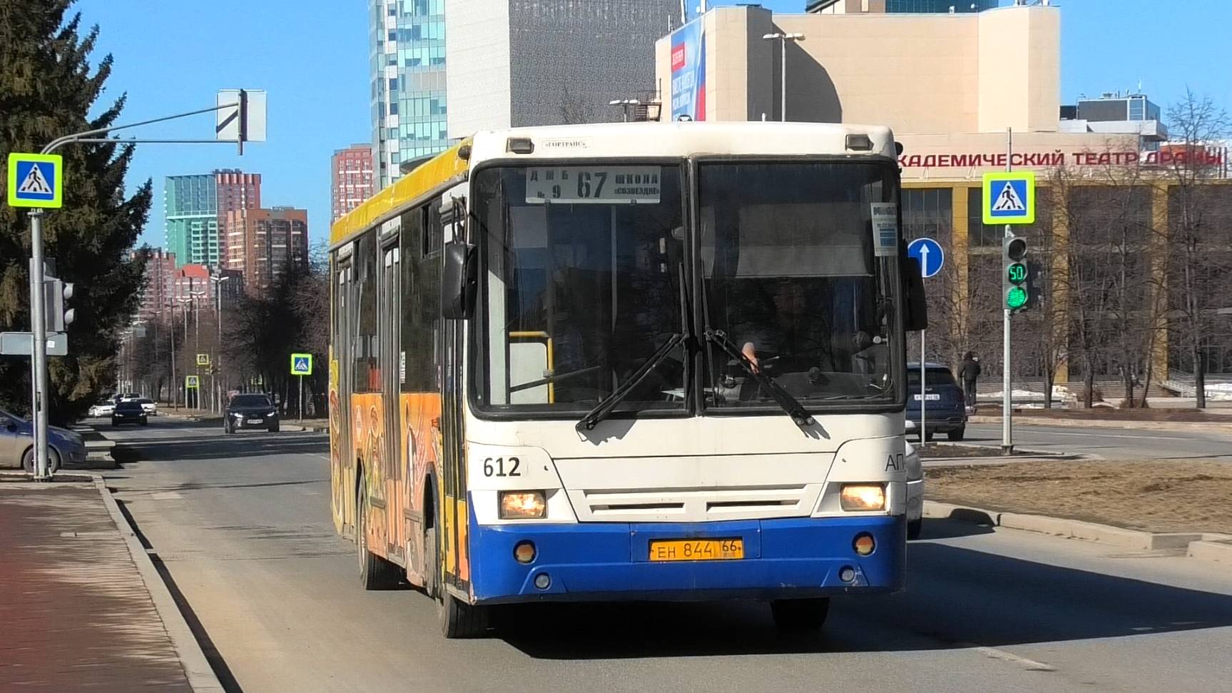 Автобус НефАЗ-5299-20-32 борт. №612 маршрут 67 следует по улице Бориса Ельцина