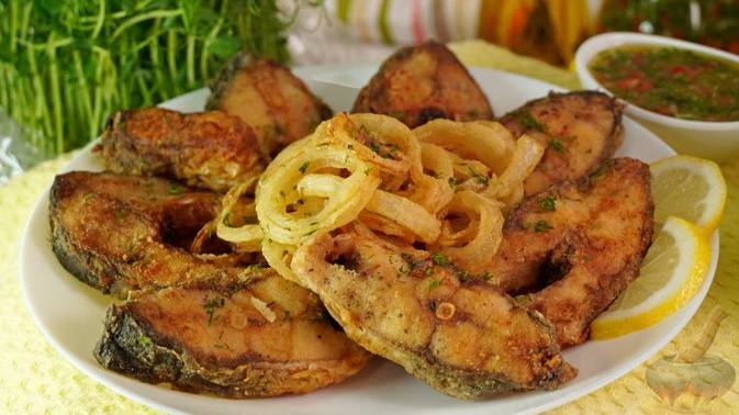 Кусочки карпа панируются в смеси кукурузной и пшеничной муки и обжариваются до золотистой хрустящей корочки, Подаётся рыба c соусом "Муждей" и луком фри. Идеальное сочетание простых продуктов. #РыбаЖареная #Карп #РыбныеБлюда