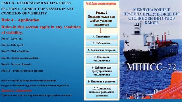 СОДЕРЖАНИЕ ПРАВИЛ МППСС-72. Часть A - Общие положения Правило 1 - Применение Правило 2 - Ответственность Правило 3 - Общие определения Часть B - Правила плавания и маневрирования Раздел I - Плавание судов при любых условиях видимости Правило 4 - Применение Правило 5 - Наблюдение Правило 6 - Безопасная скорость Правило 7 - Опасность столкновения Правило 8 - Действия для предупреждения столкновения Правило 9 - Плавание в узкостях Правило 10 - Плавание по системам разделения движения Раздел II - Плавание судов, находящихся на виду друг у друга Правило 11 - Применение Правило 12 - Парусные суда Правило 13 - Обгон Правило 14 - Ситуация сближения судов, идущих прямо друг на друга Правило 15 - Ситуация пересечения курсов Правило 16 - Действие судна, уступающего дорогу Правило 17 - Действия судна, которому уступают дорогу Правило 18 - Взаимные обязанности судов Раздел III - Плавание судов при ограниченной видимости Правило 19 - Плавание судов при ограниченной видимости Часть C - Огни и знаки Правило 20 - Применение Правило 21 - Определения Правило 22 - Видимость огней Правило 23 - Суда с механическим двигателем на ходу Правило 24 - Суда, занятые буксировкой и толканием Правило 25 - Парусные суда на ходу и суда на веслах Правило 26 - Рыболовные суда Правило 27 - Суда, лишенные возможности управляться или ограниченные в возможности маневрировать Правило 28 - Суда, стеснённые своей осадкой Правило 29 - Лоцманские суда Правило 30 - Суда на якоре и суда на мели Правило 31 - Гидросамолеты Часть D - Звуковые и световые сигналы Правило 32 - Определения Правило 33 - Оборудование для подачи звуковых сигналов Правило 34 - Сигналы маневроуказания и предупреждения Правило 35 - Звуковые сигналы при ограниченной видимости Правило 36 - Сигналы для привлечения внимания Правило 37 - Сигналы бедствия Часть E - Изъятия Правило 38 - Изъятия Часть F – Проверка соответствия положениям Конвенции Правило 39 – Определения Правило 40 – Применение Правило 41 – Проверка соответствия