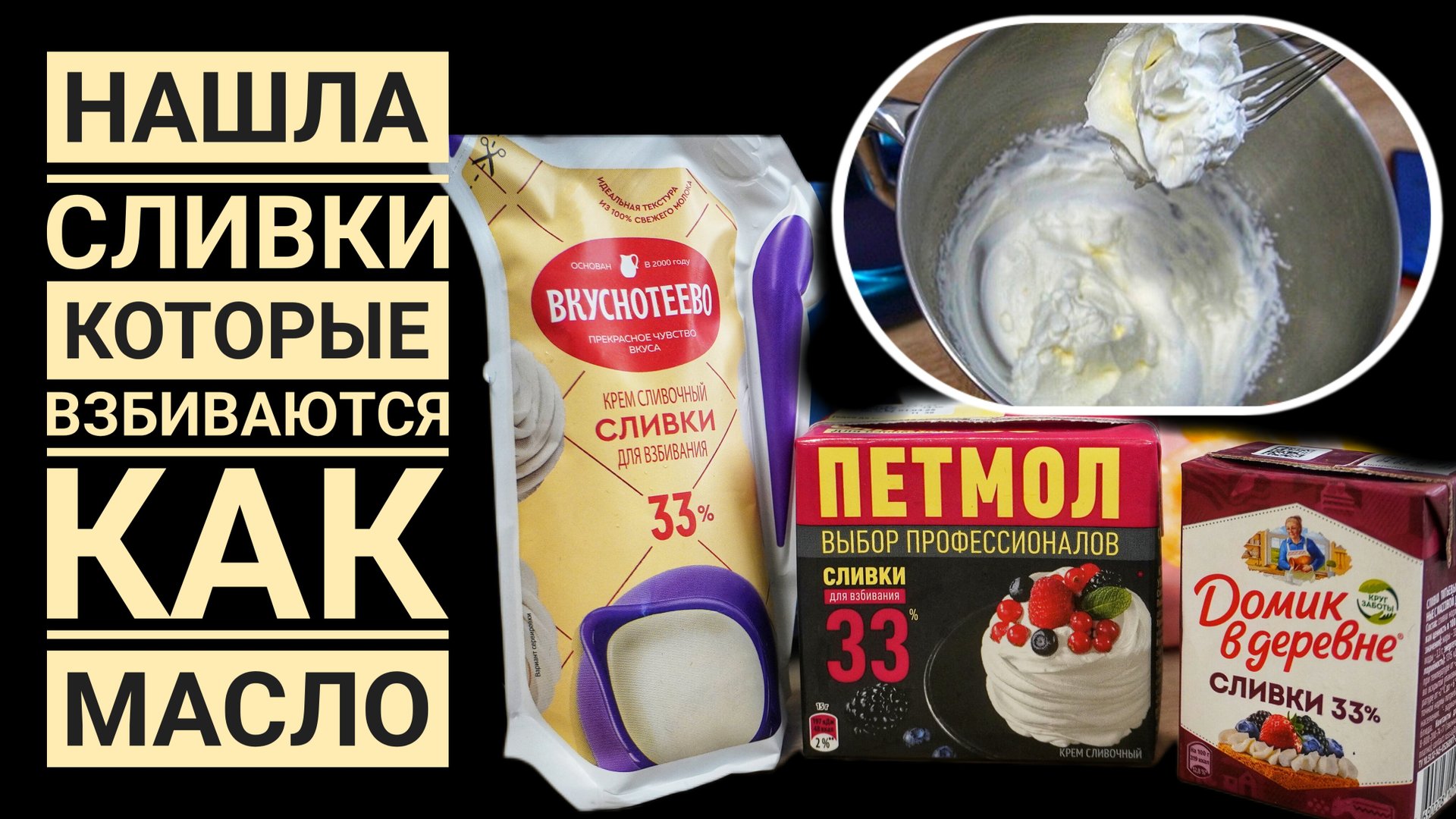 Закупила сливки 33% жирности от "Петмол", "Вкуснотеево", "Домик в деревне". Самый "натуральный из этой троицы - без добавок, это сливки от "Домик в деревне". Вкуснотеево и Петмол - это сливки с добавлением коррагинана, который придает пышную форму тесту и не опадает. 1. Вкуснотеево увеличились в объеме. Но не взбились до устойчивого состояния 2. Домик в деревне - честь и хвала за сливки. За 2 минуты взбились крепко, почти до масла. 3. Петмол- профессиональные сливки для взбивания- густые пики получились за 3 минуты 30 сек. Справедливости ради, хочу заметить , что сливки "вкуснотеево" я отправила в морозилку, чтобы сделать мороженое и оно получилось нежнейшим, натуральным, очень вкусным.