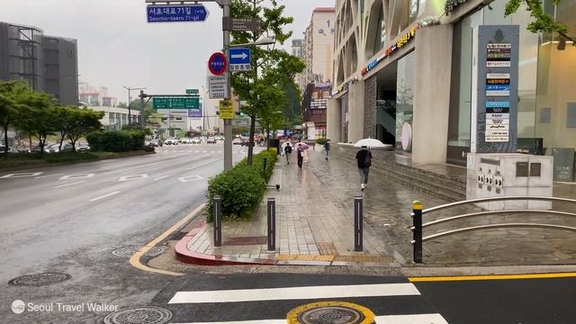 비 내리는 강남역 아침 출근길 풍경, 가뭄에 단비 내리는 강남 대로 걷기. 4K 서울 트래블 워커. 서울 강남 여행.