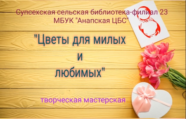 "Цветы для милых и любимых» - так называлась творческая мастерская, организованная заведующим Супсехской сельской библиотекой — филиалом № 23 МБУК «Анапская ЦБС» в преддверии Международного женского дня — 8 Марта. 8 Марта — это праздник, который любят и ждут, чтобы поздравить своих любимых бабушек, мам и сестер. Участие маленьких детей в этом замечательном празднике просто обязательно. Согласитесь, что стихотворение о маме или бабушке, рассказанное малышом, рисунок или поделка, сделанные детскими ручками — очень трогательно и мило. Поздравили всех женщин с наступающим Женским Днем и юные посетители — постоянные участники мероприятий, проводимых Супсехской сельской библиотекой — филиалом № 23 МБУК «Анапская ЦБС». Подготовлено : заведующим Супсехской сельской библиотекой — филиалом № 23 МБУК «Анапская ЦБС» С.В.Ермолаевой