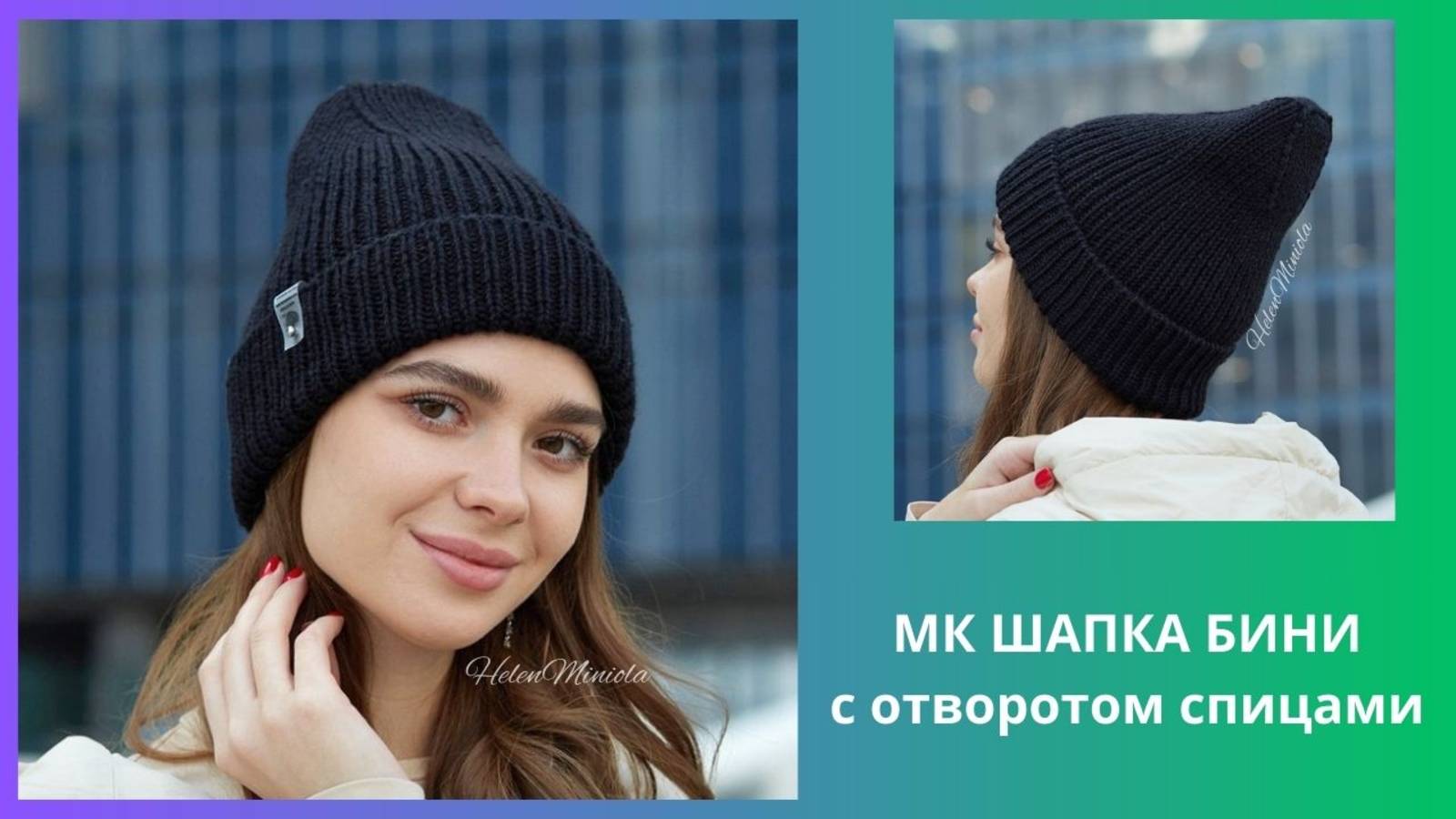 Женская шапка бини спицами с отворотом