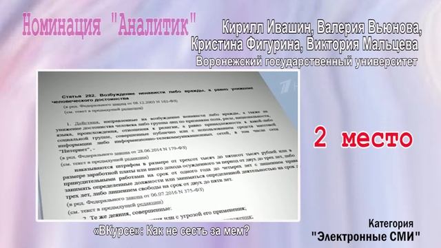 Победители II Всероссийского конкурса студенческих работ факультета журналистики Воронежского госуниверситета "Жизнь в творческом полете" в категории "Электронные СМИ".