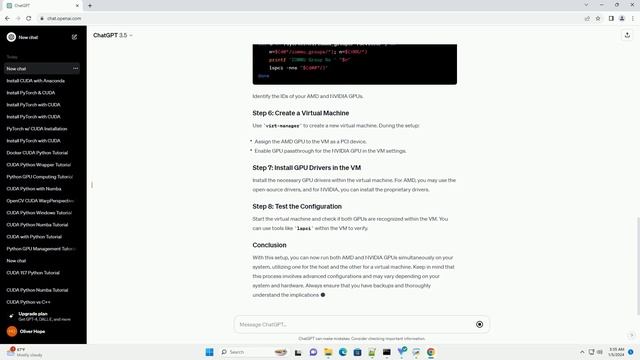 Download this code from https://codegive.com Running both AMD and NVIDIA graphics cards together in a single system is possible, and it's known as GPU passthrough or GPU virtualization. This allows you to use one GPU for the host system and another for a virtual machine (VM). Here's a step-by-step tutorial on how to achieve this using KVM (Kernel-based Virtual Machine) on a Linux system. Note that this process requires a CPU with hardware virtualization support (Intel VT-x or AMD-V) and IOMMU (Input-Output Memory Management Unit) support. Hardware Requirements: Software Requirements: Check if your CPU supports hardware virtualization and if IOMMU is enabled. You can usually find this information in your system's BIOS/UEFI settings. Edit your GRUB configuration to enable IOMMU. Open the GRUB configuration file: Add the following parameters: Save the file and update GRUB: Reboot your system to apply the changes. Verify that IOMMU is correctly configured and identify the IOMMU groups of your GPUs: Identify the IDs of your AMD and NVIDIA GPUs. Use virt-manager to create a new virtual machine. During the setup: Install the necessary GPU drivers within the virtual machine. For AMD, you may use the open-source drivers, and for NVIDIA, you can install the proprietary drivers. Start the virtual machine and check if both GPUs are recognized within the VM. You can use tools like lspci within the VM to verify. With this setup, you can now run both AMD and NVIDIA GPUs simultaneously on your system, utilizing one for the host and the other for a virtual machine. Keep in mind that this process involves advanced configurations and may vary depending on your system and hardw