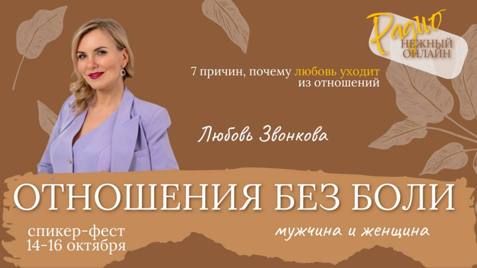 Мужчина и женщина: как построить отношения без боли и предательства Любовь Звонкова (https://t.me/lyubov_zvonkova_psy) На эфире вы узнаете: ▪️ 7 причин, почему любовь уходит из отношений ▪️Как разделить ответственность с партнером ▪️Как стать ценной женщиной для мужчины ▪️Практика «Внутренняя опора» Эфир проводит Любовь Звонкова (https://t.me/lyubov_zvonkova_psy) - психолог, сексолог, психотерапевт - проводник в тонкий план - дипломированный специалист по психосоматике - сертифицированный коуч ICU - спикер Сколково - автор и ведущая трансформационных тренингов для женщин, меняющих жизнь - 20 лет замужем, двое детей погодок - 10 лет психотерапевтического опыта В моей жизни и профессии – всё про любовь и с любовью❤️ 👉🏻 ПОДПИШИТЕСЬ (https://t.me/lyubov_zvonkova_psy) Регистрируйтесь и получайте подарки от наших экспертов! ⬇️⬇️⬇️⬇️⬇️ ЗАРЕГИСТРИРОВАТЬСЯ https://app.leadteh.ru/w/eu7cV ______________________________________ 🎙Если вы хотите стать спикером радио, попасть на подкаст, открыть свою передачу, пишите 👉 сюда https://t.me/m/sApQQFV0ZDgy