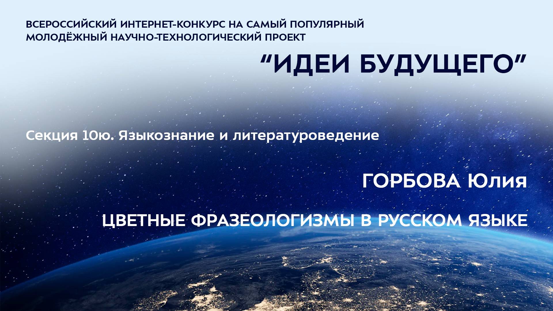 (10Ю-3) ГОРБОВА Юлия Александровна Республика Северная Осетия — Алания, г. Владикавказ МАУ ДО «ЦДО г. Владикавказа», СП Центр развития творчества одаренных детей и юношества «Интеллект», 7 класс ЦВЕТНЫЕ ФРАЗЕОЛОГИЗМЫ В РУССКОМ ЯЗЫКЕ Научный руководитель: Доева Виктория Сергеевна, Республика Северная Осетия — Алания, г. Владикавказ, МАУ ДО «ЦДО г. Владикавказа», СП Центр развития творчества одаренных детей и юношества «Интеллект», педагог дополнительного образования Более подробно о мероприятиях Программы "Шаг в будущее" можно узнать на сайтах http://www.step-into-the-future.ru/ и http://шагвбудущее.рф
