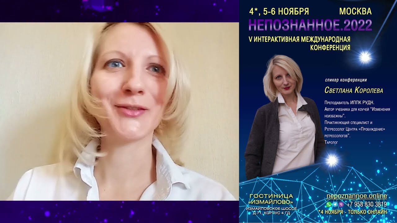 5 и 6 ноября в Москве очно состоится юбилейная, V международная интерактивная конференция «Непознанное.2022». Оба дня из основного зала и мастер-классов будет идти трансляция онлайн, и также будет доступна запись в личном кабинете. В 2022 году на юбилейной интерактивной конференции НЕПОЗНАННОЕ Светлана КОРОЛЁВА представит свой мастер-класс – Эфирные масла в работе помогающего практика (доступен очно и онлайн) https://nepoznannoe.online/ - подробнее об интерактивной конференции, спикере, детали, билеты и программа по этой ссылке