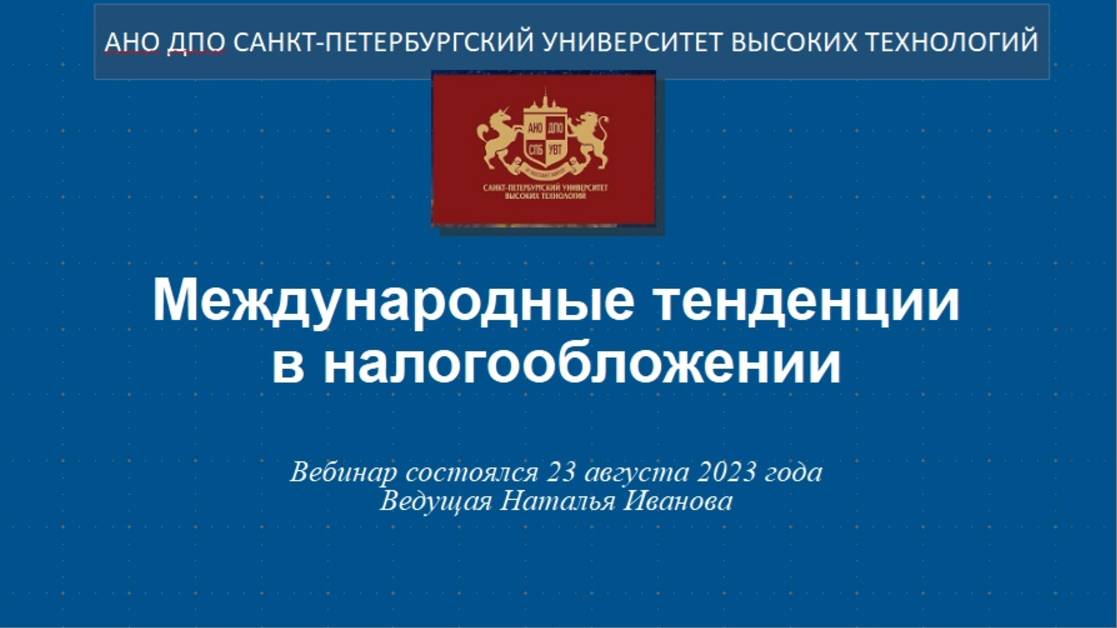 Международные тенденции в налогообложении (2023) Четвертый вебинар Книжной лавки на эту тему состоялся 23.08.2023 г. Видео материал к вебинару, вырезан из ролика из-за ограничения по времени - http://my.mail.ru/mail/al3101961/video/16/1530.html Ведущая — Наталья Иванова Смотреть по теме: Международные тенденции в налогообложении. https://ogurcova-portal.com/mezhdunarodnyie-tendentsii-v-nalogooblozhenii/ (2015/2016/2018/2023) Первый вебинар 2015 года - https://rutube.ru/video/837ded73f58b506a42df8199645a2c01/ Второй вебинар 2016 года - https://rutube.ru/video/320a61b1355a3f7682d7fe4156f48cdd/ Третий вебинар 2018 года - https://rutube.ru/video/1550376238835bd50e2e092460223e01/ Источники: Научно-технический портал «Технарь» https://ogurcova-online.com/ "Книжная лавка" https://ogurcova-portal.com/ "Литературное обозрение" https://litobozrenie.com/ Вебинар разработан и проведен в рамках образовательных программ АНО ДПО СПБ УВТ - Санкт-Петербургский университет высоких технологий https://univer.spb.ru/ в соответствии с законодательством об образовательной деятельности в РФ N 273-ФЗ по лицензии №3911 Комитета по образованию Правительства СПб https://univer.spb.ru/wp-content/uploads/2019/12/license015small-1.jpg