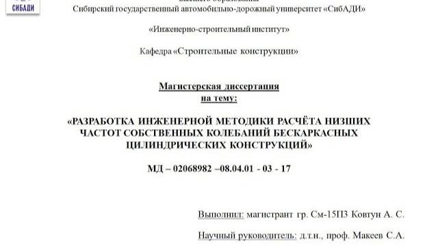 Представлен процесс защиты магистерской диссертации в СибАДИ (ИСИ). Направление подготовки 08.04.01 «Строительство», магистерская программа 'Теория и проектирование зданий и сооружений'. Выполнил магистрант Ковтун А.С. Тема: «Разработка инженерной методики расчета низших частот собственных колебаний бескаркасных цилиндрических конструкций». Руководитель программы д-р техн. наук, профессор Макеев С.А. Теги: магистратура,защита,диссертация,Ковтун