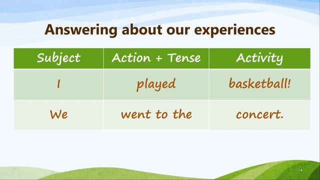 Hello class! Welcome back to your English lesson of the week! Today, we're going to learn about how to talk about our experiences. Please download the worksheet and send it to my email after you have finished it! Don't forget to put your name, grade, and class number on the worksheet!