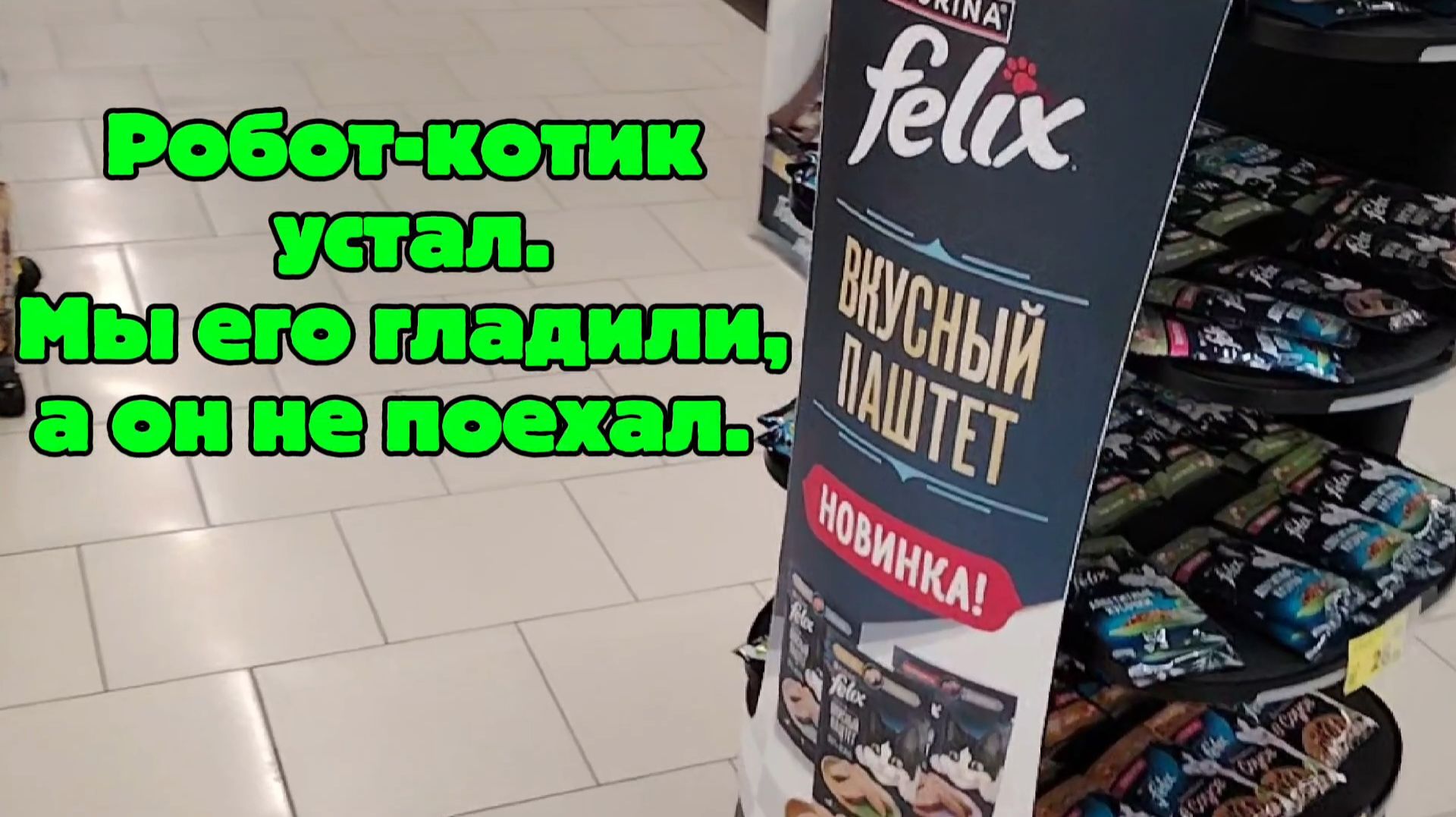 Робот-кот устал. Здравствуйте, мои дорогие подписчики и гости моего канала. Хочу показать вам робота-котика, который уже несколько месяцев в магазине "Магнит" разъезжает между рядов с продуктами, общается с покупателями, дарит им хорошее настроение и предлагает приобрести корм для наших питомцев. Этот робот катается по магазину, неся на себе товары для кошек, и предлагали покупателям приобрести их. Реакция посетителей позитивная и удивлённая, особенно он нравится детям. Они гладят его и разговаривают с ним. Сегодня он также катался по магазину, но устал... Сколько мы его не гладили, он не оехал😀. #робот#роботкотик#помощниквмагазине#краснодар#