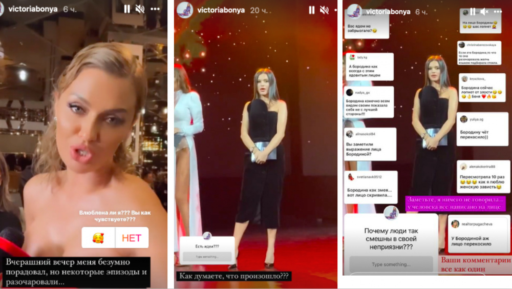 Блогер уверена, что бывшие коллеги по «Дому-2» завидуют её успеху и красоте Вчера 41-летняя модель и блогер получила премию «Лучший развивающий проект для женщин 2021». Во время вручения награды на сцене оказалась её занятая подруга Ксения Бородина. Увидев Боню, она демонстративно отвернулась и сделала «недовольное лицо». Боня, не прекращая улыбаться, сказала, что они давно не подруги, потому что ей не нравятся люди которые «распускают свой поганый язык». Ну а чтобы реакция Бородиной была заметнее, Виктория опубликовала видео и скриншоты сообщения от подписчиков в своём Инстаграм, сообщив, что некоторые эпизоды вечера её разочаровали. «Почему люди так смешны в своей неприязни?» – задалась вопросом Боня, намекая на Бородину. В тот же день Виктория умудрилась поссориться с ещё одной экс-ведущей «Дома-2» Ксенией Собчак. Во время визита к известному визажисту Сердар Камбарову она продемонстрировала свой фирменный макияж, который, по её словам, стоит миллион рублей. А затем сказала, что этот образ очень нравится Ксении Собчак, которая даже приходит в салоны красоты с фотографией Бони, чтобы его скопировать. С нетерпением ждём, как ответят на такие выпады не менее острые на язык Бородина и Собчак.