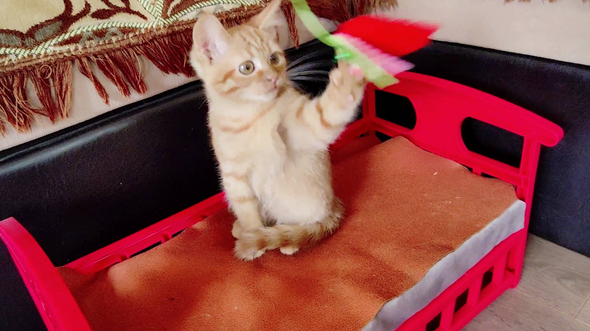 Котенок. Красивая игрушка и красивая кровать.