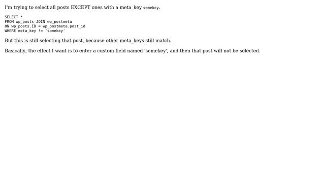 Wordpress: If meta_key exists then don't select this post? Helpful? Please support me on Patreon: https://www.patreon.com/roelvandepaar With thanks & praise to God, and with thanks to the many people who have made this project possible! | Content (except music & images) licensed under CC BY-SA https://meta.stackexchange.com/help/licensing | Music: https://www.bensound.com/licensing | Images: https://stocksnap.io/license & others | With thanks to user user69517 (wordpress.stackexchange.com/users/69517), user Milo (wordpress.stackexchange.com/users/4771), and the Stack Exchange Network (wordpress.stackexchange.com/questions/182065). Trademarks are property of their respective owners. Disclaimer: All information is provided "AS IS" without warranty of any kind. You are responsible for your own actions. Please contact me if anything is amiss at Roel D.OT VandePaar A.T gmail.com