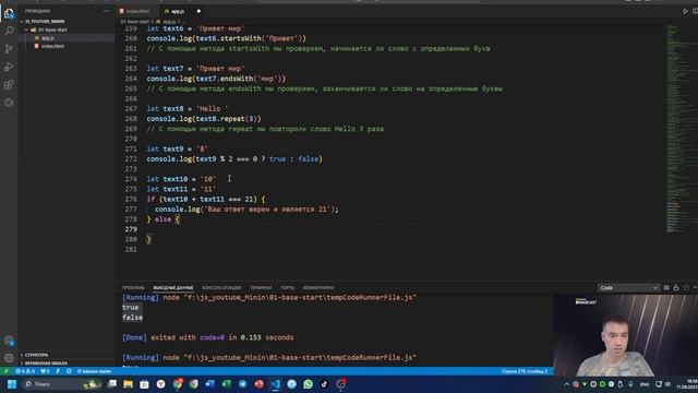 28 просмотров 17 апр. 2023 г. ИШИМБАЙ ❇️?JavaScript - Изучение тем: Строки, Шаблонные строки, Условные операторы,Массивы, Функции ________________________________ ❄️ Группа ВК - http://bit.ly/3Qo9m7s ? Группа Facebook - https://bit.ly/43YvFa6 ❇️ Личная страница VK - http://bit.ly/3GP3XAp ? Личная страница Instagram - https://bit.ly/3FdYEtK ________________________________ ? Принимаю заявки на ваши заказы ? Принимаю заявки на индивидуальное обучение ________________________________ ✅ В этом видео мы рассмотрим, как правильно обучаться языку программирования JavaScript Работа со строками: ✅ toUpperCase() и toLowerCase(): Как изменить регистр символов в строке. ✅ .indexOf(): Как находить позицию подстроки в строке. ✅ .replace(): Как заменять подстроки в строке. ✅ .slice(start, end): Как вырезать часть строки. ✅ .startsWith() и .endsWith(): Как проверять начало и конец строки. ✅ .repeat(): Как повторять строку заданное количество раз. ✅Шаблонные строки ${}: Как создавать динамические строки с использованием переменных. Условные операторы: ✅ % (оператор остатка): Как использовать остаток от деления. ✅ if, else: Как создавать условные выражения для принятия решений. Работа с массивами: ✅ .push() и .unshift(): Как добавлять элементы в массив. ✅ .pop() и .shift(): Как удалять элементы из массива. ✅ Цикл for: Как перебирать элементы массива и выполнять действия с ними. Функции и работа с массивами: ✅.split(''): Как разбивать строку на массив символов. ✅.reverse(): Как переворачивать массив. ✅.join(''): Как объединять элементы массива в строку. Эти базовые концепции и методы JavaScript являются фундаментом для создания динамических веб-приложений. После просмотра этого видео, вы будете готовы к более глубокому изучению языка и созданию интересных проектов. Давайте начнем обучение! ________________________________ Курс web разработке предназначен для новичков в области веб-программирования, будет полезен как для школьников старших классов и студентов технических специальностей, так и для всех людей, которые интересуются веб-технологиями или планируют начать карьеру в этой индустрии. Полученный уровень подготовки позволит вам начать карьеру HTML-верстальщика, PHP – Разработчика или JavaScript разработчика. #Academy_site #НиколайКарнаушенко #Верстка #СозданиеСайтов