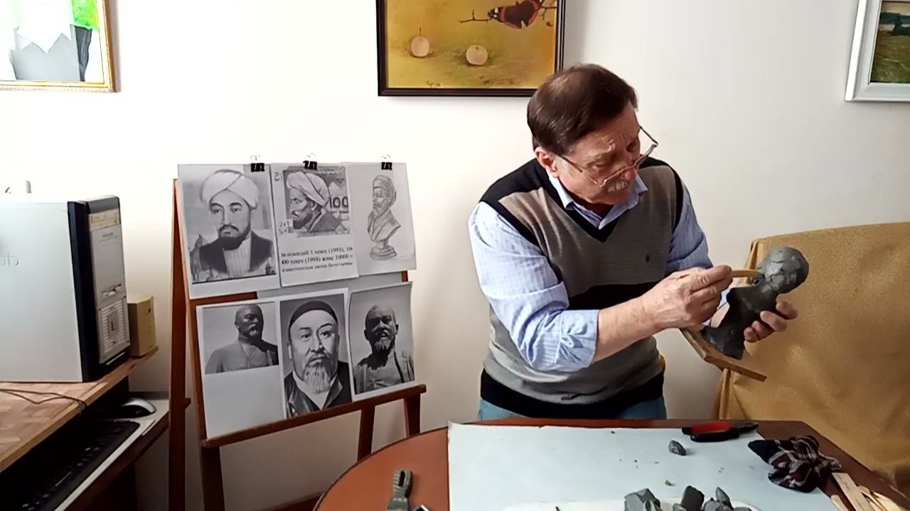 В этом третьем, заключительном уроке по скульптурному портрету с плечевым поясом учитель показывает, как перейти от набранной общей массы к детальной проработке лица и довести работу до логического завершения. С опорой на эскиз педагог напоминает о пропорциях: линия глаз располагается строго посередине головы (без учёта бороды), ниже последовательно намечаются нос, рот и подбородок, ширина носа соотносится с расстоянием между глазами. Затем по намеченной сетке уточняются надбровные дуги, переносица, форма носа, усы, губы и борода, которые слегка выносятся вперёд. Учитель подробно обращает внимание на конструктивные элементы: скулы, щёки, височные кости, мышцы под глазами и вдоль челюсти, подчёркивая необходимость лепить их симметрично сразу с двух сторон. Отдельно разбирается постановка ушей по классической схеме — между уровнем кончика носа и верхнего века, частично уходящих под головной убор. В процессе работы применяется стек для уточнения форм, убирания излишков и сглаживания переходов. Учитель советует постоянно осматривать портрет в фас и профиль, прищуриваясь, чтобы лучше видеть общую форму, и не увлекаться чрезмерным утрированием отдельных деталей. В финале демонстрируется готовый портрет Аль‑Фараби как ориентир для учеников, и им предлагается выполнить аналогичную работу с выбором героя (Аль‑Фараби или Абай). Педагог завершает урок пожеланиями творческих успехов и ждёт от учащихся их законченные скульптурные портреты. Автор - художник Гончаров Николай Васильевич (1944-2025)
