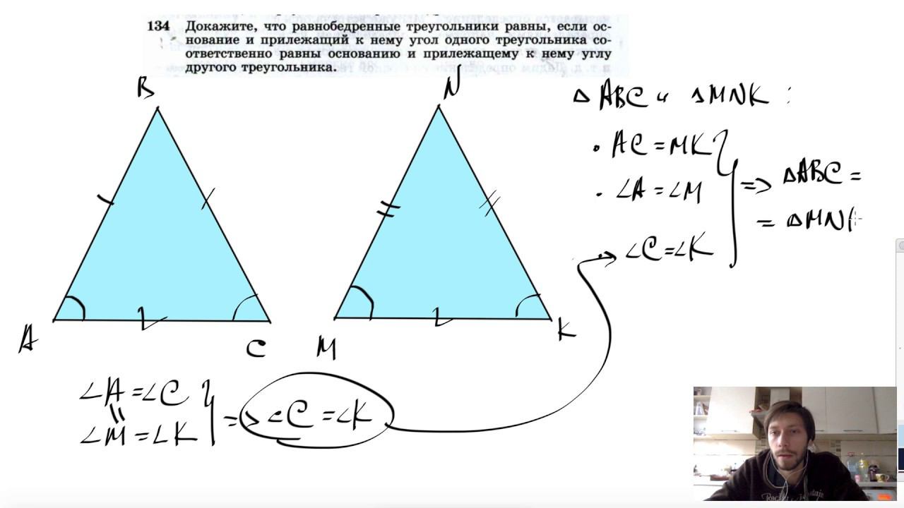 №134. Докажите, что равнобедренные треугольники равны, если основание и прилежащий к