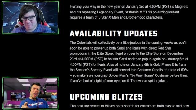 2022 is in full swing and it's time to discuss all the latest news of Marvel Strike Force. This week I am joined by Boilon and we discuss Tower Mode, Fresh Horizons and more including: Tower Mode Thoughts 01:22 12 Days of Scopely 07:45 H4H - Best Team for New Players? 10:34 Scarlet Spider Best Web Warrior? 13:00 Fresh Horizons Event 15:17 Pocket Dimensions and Best Resolute 19:30 Ghost Spider Blitz tonight 24:13 Spider Punk Coming Soon 26:05 Ikaris to Red Star Store! 27:27 Tadano Mac Shards When? 29:28 Doc Ock Returning... when Omega Red? 31:24 Zemo Costume of Silver Samurai? 33:58 T'Challa Coming How- Knowhere Heist? 37:39 Apocalypse Coming in 2022 39:36 Next Legendary unlock guesses 41:22 New Tech and Horsemen Rumors 44:04 Spider-Man Far From Home Discussion (SPOLIER WARNING) 49:13 Final Thoughts 56:57 see more Boilon https://www.youtube.com/channel/UC7lNaBgwLVbXIwUTy9tRg3w: https://www.twitch.tv/boilon89 Get up to 20% off your in-game purchases with Amazon coins: https://l.linklyhq.com/l/L6XG #MarvelStrikeForce ValleyFlyin76 Channel (Marvel Future Revolution) http://bit.ly/2oHqk8E Other Sponsors: LD Player: https://bit.ly/LDPMFR Bluestacks 5: http://bit.ly/VFBlue CBD from POP Colorado 10% Discount: https://popcolorado.com/?valleyflyin=3 LOOTCAKES Rewards: https://lootcakes.com/register/step1/... SKILLSHARE Premium Free Trial: https://skl.sh/valleyflyin12211 Worldwide Nutrition 15% Discount: https://worldwidenutrition.com/pages/... More ValleyFlyin: Valleyflyin Merch: http://bit.ly/VFMerch Discord: http://bit.ly/valleyflyin Twitter: https://twitter.com/valleyflyin Instagram: https://www.instagram.com/valleyflyin/ Facebook: https://www.facebook.com/Valleyflyin/ Twitch: http://bit.ly/vftwitch Patreon: http://bit.ly/VFPatreon