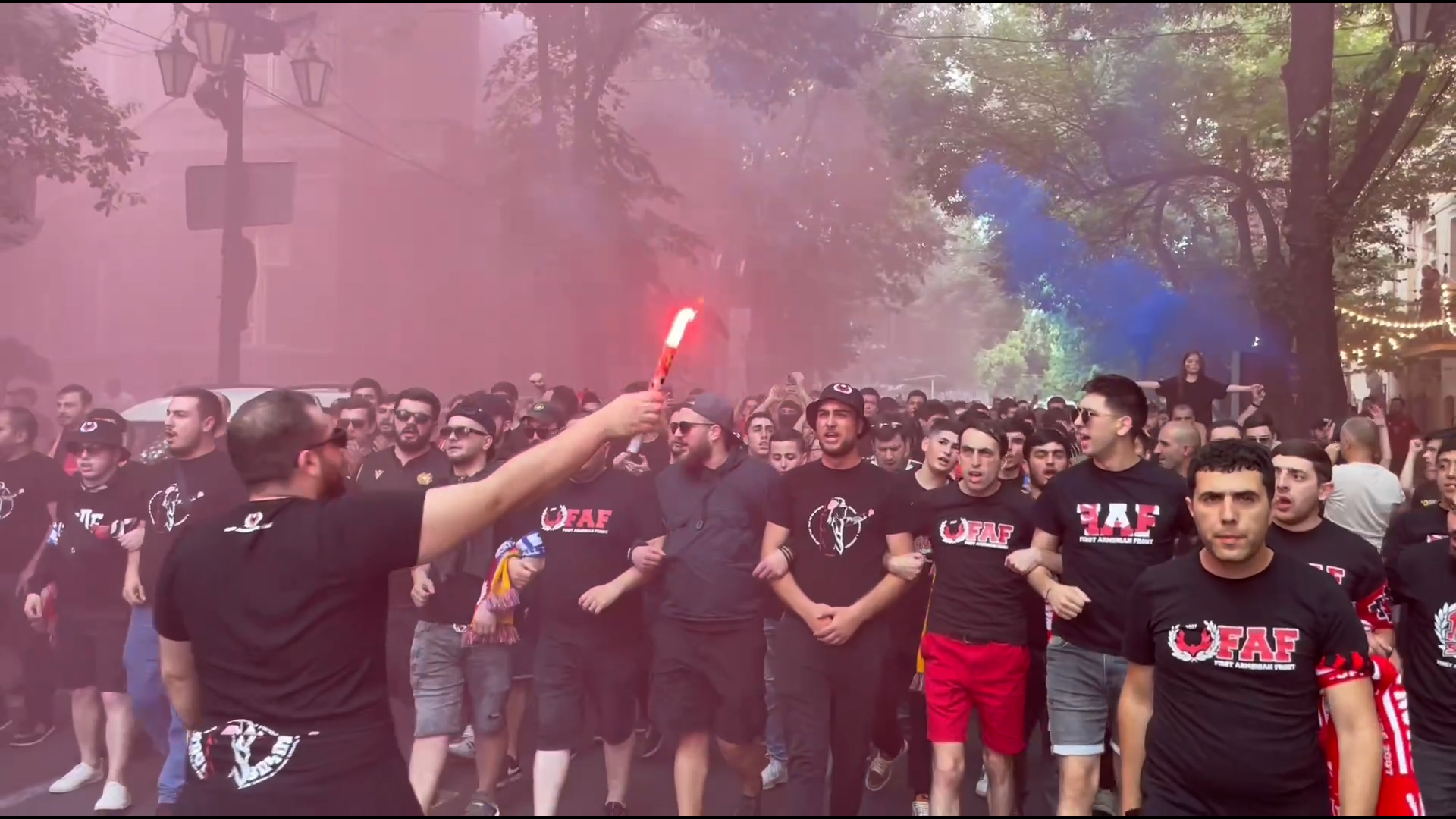 Հայաստանի ֆուտբոլի հավաքականի երկրպագուները, ՀՀ օրհներգը երգելով, շարժվում են դեպի մարզադաշտ