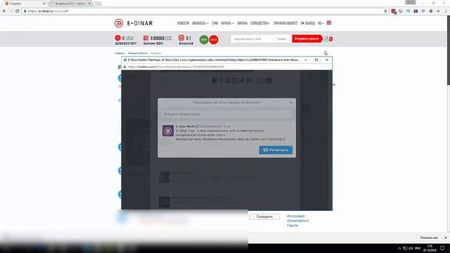 Как начать зарабатывать в проекте единар , пошаговые действия В это видео ролике вы узнаете Как начать зарабатывать без вложение в проекте E-Dinar 1) как привязать аккаунты социальных сетей, в проекте единар (Е-Динар) 2) Как выполнять задание в проекте единар (E-Dinar) 3) Как создать технический кошелек в проекте E-Dinar 4) Как ставить деньги на манинг в проекте единар (E-Dinar Coin)