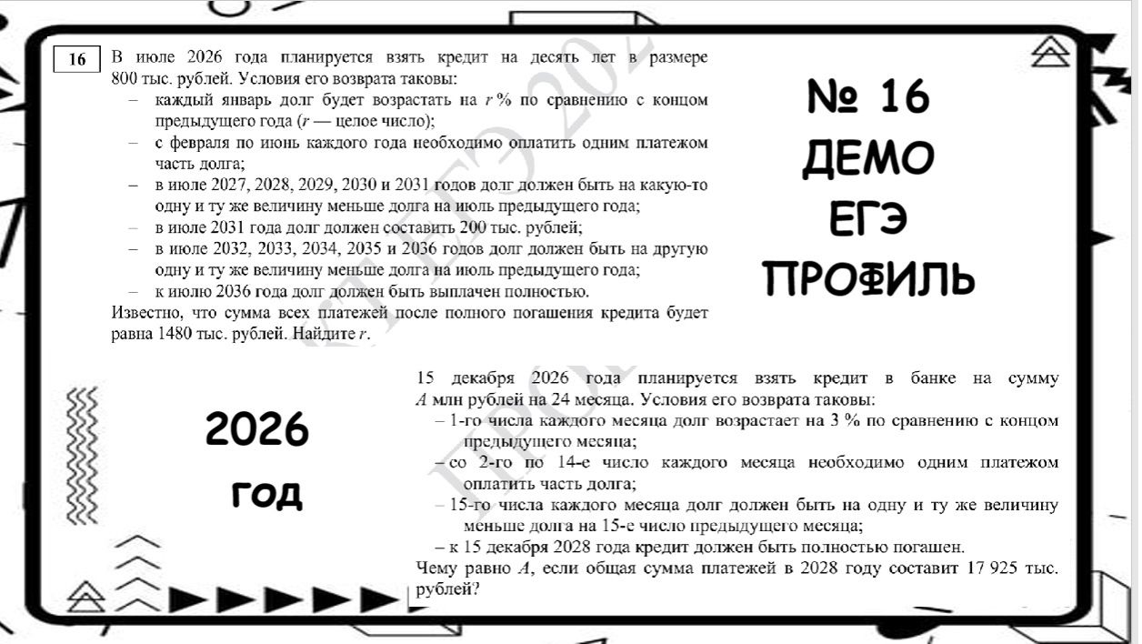 ДЕМО профль 2026 Математика № 16 Экономические задачи В июле 2026 года планируется взять кредит на десять лет в размере 800 тыс. рублей. Условия его возврата таковы: – каждый январь долг будет возрастать на r % по сравнению с концом предыдущего года (r — целое число); – с февраля по июнь каждого года необходимо оплатить одним платежом часть долга; – в июле 2027, 2028, 2029, 2030 и 2031 годов долг должен быть на какую-то одну и ту же величину меньше долга на июль предыдущего года; – в июле 2031 года долг должен составить 200 тыс. рублей; – в июле 2032, 2033, 2034, 2035 и 2036 годов долг должен быть на другую одну и ту же величину меньше долга на июль предыдущего года; – к июлю 2036 года долг должен быть выплачен полностью. Известно, что сумма всех платежей после полного погашения кредита будет равна 1480 тыс. рублей. Найдите r. 15 декабря 2026 года планируется взять кредит в банке на сумму A млн рублей на 24 месяца. Условия его возврата таковы: – 1-го числа каждого месяца долг возрастает на 3 % по сравнению с концом предыдущего месяца; – со 2-го по 14-е число каждого месяца необходимо одним платежом оплатить часть долга; – 15-го числа каждого месяца долг должен быть на одну и ту же величину меньше долга на 15-е число предыдущего месяца; – к 15 декабря 2028 года кредит должен быть полностью погашен. Чему равно A, если общая сумма платежей в 2028 году составит 17 925 тыс. рублей?