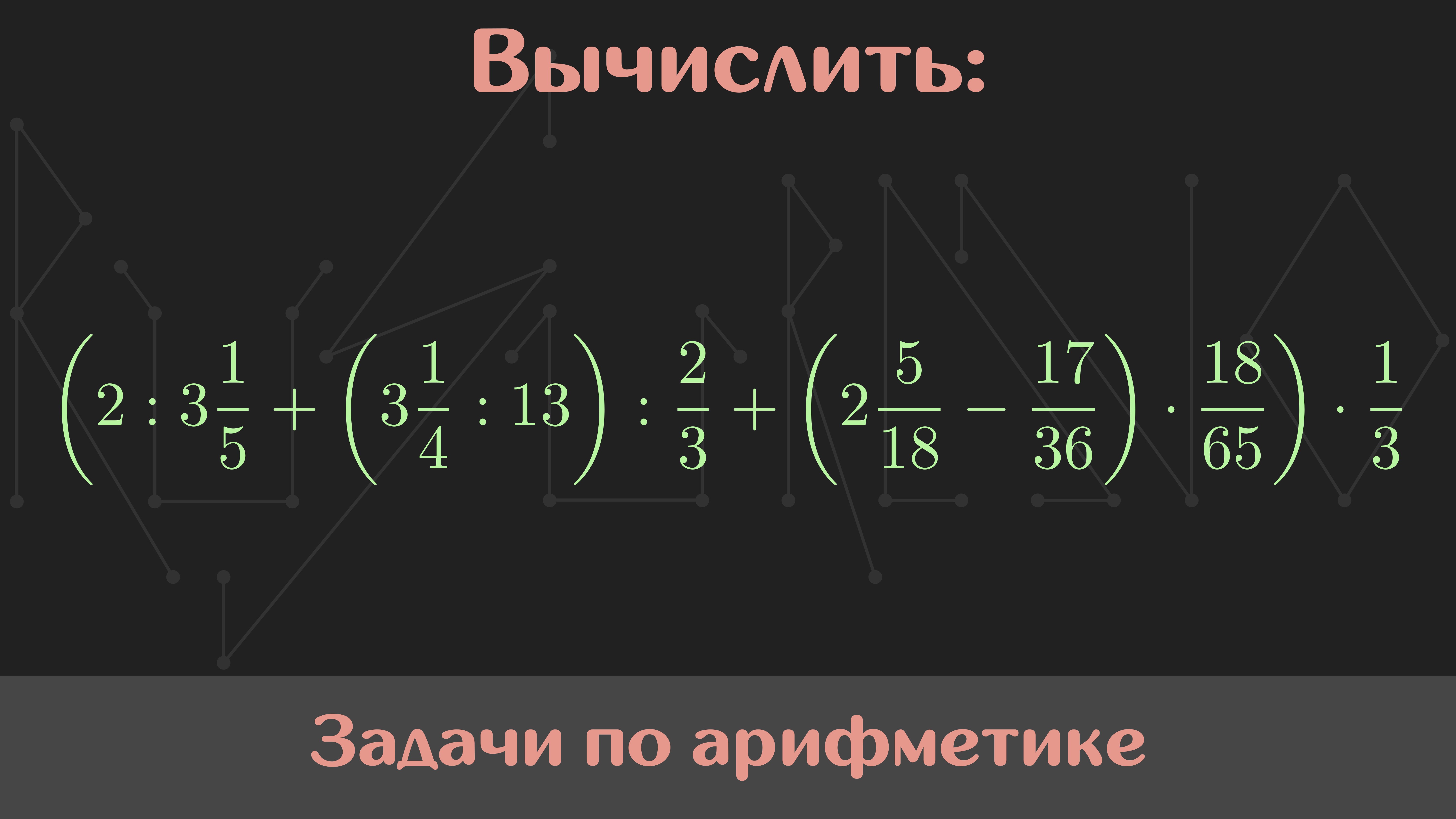 Мой курс по арифметике: https://stepik.org/a/195543 Условие: Вычислить (2 : 3[1/5] + (3[1/4] : 13) : 2/3 + (2[5/18] - 17/36) * 18/65) * 1/3 Памятка: перед просмотром решения задания обязательно попробуйте решить задачу самостоятельно. Так вы научитесь вырабатывать собственный подход к решению. Музыка: Nomyn — Moonlight #Сканави #Арифметика #РешайСоМной #Математика