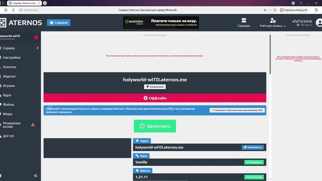 Aternos _ Серверы Minecraft. Бесплатно. Навсегда. — Яндекс Браузер 2026-03-02 22-43-30