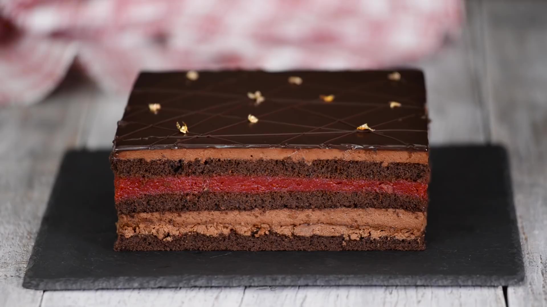 Ингредиенты: Для бисквита: Яйца — 6 шт. Сахар — 150 г. Мука — 120 г. Какао-порошок — 50 г. Растопленное сливочное масло — 50 г. Разрыхлитель — 5 г. Ванильный экстракт — 1 ч.л. Соль — щепотка Для хрустящего слоя: Растопленный молочный шоколад — 75 г. Ореховое пралине — 100 г. Вафельная крошка — 80 г. • Ореховая паста «Пралине» — «Видео как делать ореховую паста «Пралине», есть на канале» Для шоколадного мусса: Тёмный шоколад — 120 г. Сливки 33-35% — 300 мл. Желтки — 2 шт. Сахар — 70 г. Вода — 35 мл. Желатин — 7 г. Холодная вода «для желатина» — 40 мл. Вишневое компоте: Вишнёвое пюре — 270 г. Вишня «без косточек» — 100 г. Желатин — 8 г. Холодная вода «для желатина» — 50 мл. Кукурузный крахмал — 10 г. Сахар — 80 г. Лимонный сок — 1 ч.л. Для вишнёвой пропитки: Свежевыжатый вишнёвый сок — 100 мл. Вода — 60 мл. Сахар — 60 мл. Кирш «вишнёвый ликёр» — 2 ст.л. Для шоколадной глазури: Тёмный шоколад — 80 г. Горячие сливки 20% — 60 мл. Сливочное масло — 10 г. Для украшения: Растопленный тёмный шоколад Сусальное золото Все ингредиенты для бисквита должны быть комнатной температуры. 1. Разогреть духовку до 180 °С. 2. Приготовить бисквит. В миске смешать муку, какао-порошок, разрыхлитель и соль. Отложить в сторону. Яйца взбить до однородности, затем добавить к ним сахар. Поставить миску с яично-сахарной смесью на водяную баню «так, чтобы миска не касалась кипящей воды», постоянно помешивая нагреть яйца до 60 °С. Снять миску с водяной бани и взбить яйца миксером в течение 10-12 минут, на максимальной скорости. Масса должна посветлеть и увеличиться в объёме. Затем добавить ванильный экстракт. Постепенно ввести сухие ингредиенты. Аккуратно перемешать лопаткой снизу вверх до однородной массы. Добавить растопленное сливочное масло и ещё раз перемешать. 3. Вылить тесто в две формы, размером 25х35 см, предварительно застеленные пергаментной бумагой. 4. Выпекать в разогретой духовке 12-15 минут. Готовые бисквиты вынуть их духовки, переложить на решётку и остудить до комнатной температуры. С каждого бисквита вырезать по квадрату, размером 20х20 см, а из обрезков, что остались вырезать третий корж. 5. Приготовить вишнёвую пропитку. В сотейнике соединить вишнёвый сок, воду и сахар. Поставить сотейник на огонь и довести до кипения. Снять с огня, перелить сироп в чистую миску, добавить кирш и перемешать. Остудить сироп до комнатной температуры. 6. Приготовить хрустящий слой. Молочный шоколад растопить в микроволновке или на паровой бане. К растопленному шоколаду добавить пралине и вафельную крошку. Перемешать до однородности. 7. Дно квадратной формы, размером 20х20 см. затянуть пищевой плёнкой и поставить на ровную плоскую поверхность «например, разделочную доску». Стенки формы проложить кондитерской ацетатной плёнкой. Первый корж положить на дно формы, пропитать сиропом. Сверху выложить хрустящий слой и плотно утрамбовать. Убрать форму в холодильник на 30 минут. 8. Приготовить вишнёвое компоте. Желатин залить водой и оставить на 10 минут. Вишнёвое пюре поместить в сотейник с сахаром, лимонным соком и кукурузным крахмалом, хорошо перемешать. Поставить на средний огонь и постоянно помешивая, варить до загустения. Снять с огня, добавить разбухший желатин. Хорошо перемешать до полного растворения желатина. Затем добавить вишню без косточек и перемешать «если вишня крупная, то порежьте ее пополам». Полученную массу остудить до