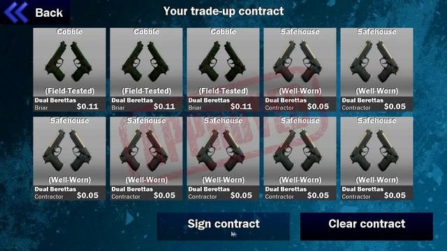 The idea of this is simple, you choose any 10 weapons from any quality, any tier and make one new weapon out of them. You can see detailed information about weapons and your doings. This is excatly like the original, every weapon is in the game! Also it is possible to save the weapon you got to you storage. Download(Android): https://play.google.com/store/apps/details?id=com.mangousltd.contracttradeup iTunes: https://itunes.apple.com/app/id971739057