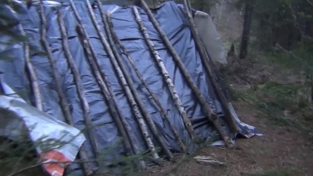 Конструкция таежного балагана или шалаша проста. Конечно выбирается сухое место, желательно уже с уклоном, в сторону таежного костра нодьи. Учитывается также ветра, которые могут дуть с реки. Первоначально балаган был построен между двумя огромными деревьями пихта и ель. Кинута перекладина между стволами этих деревьев и вместо клеенки сначало использовалась просто огромные ветки пихты, в затяжной дождь пришлось заменить ветки, точнее поверх них положены метровые обрезки коры пихты. Прошло более 60 лет и деревья погибли, остались пни. Сейчас боковины шалаша вырублены из рогатин, ольхи и черемухи и рябины. Также на рогатинах держится навес. На рогатины кладем длинные отесанные от сучьев стволы пихты или ели. На поперечену кладем кладем также держатели клеенки, также стволики пихты и ели. Затем снизу начинаем стелить клеенку, если нет клеенки, то можно выкладывать ветками пихты или обрезками коры пихты или обрезками коры березы. Сверху накрываем клеенку стволиками пихты и ели, чтоб не унесло клеенку ветром. Наклон поверхности клеенки выбирается с учетом, чтоб тепло идущее от таежного костра нодьи, отражалось на Вас. У нас этот угол равен 45 градусов. Навес очень удобен при дожде, можно спокойно переодеться на ночь в проливной дождь. Сделан под ноги ограничитель, который не дает Вам ночью сползти в таежный костер нодьи. На этом ограничителе удобно сидеть и чувствуешь спя себя спокойно, что ноги в костер ночью не попадут. Выбирается правильно расположение костра. Чтоб отпугнуть медведя, костер нодью разводим ночь из стволов пихты и ели, а также лиственницы. Древесина которых пронизана смоляными кармашками и при нагреве эти кармашки взрываются, стреляют и уголь от стволов летит в стороны, чтоб не сгореть в балагане шалаша, мы ставим на костер нодью поперечины и отлетевший уголь бьется в поперечину. За 60 лет не тожто ни разу не сгорели, даже фуфайки не прожгли. Можно и очень удобно рядом смастерить столик накрыть его корой березы или пихты. подробно в видео...