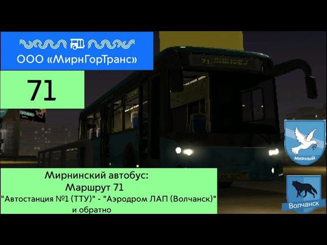 Во время пандемии по всему миру, в реальности съёмки электробуса и метро переносятся на следующий год. А пока буду записывать игры которые связанные с транспортом, это Гаррис мод Метрострой и в первый раз записываю МТА Провинцию. Сначала, начнем обкатывать автобусные маршруты в городе Мирный. Мирнинский автобус ООО МирнГорТранс состоит из 4 маршрутов (71, 79, 82 и 90). Водитель автобуса доступен только с 4-го уровня. 1-й маршрут на котором мы поедем N° 71 на автобусе ЛиАЗ 5292.30. Этот маршрут соединеняет город Мирный и ПГТ Волчанск. Он пригородный и запущенный в 2017 году. Поездка в прямом направлении: Автостанция N° 1 ТРЦ "Тандем" Станция технического обслуживания - Таксопарк N° 1 - АТП Банк ЖД Вокзал Мирный Офис РЖД Арена "Мирный" - Казино Водохранилище Аэродром ЛАП (Волчанск) Поездка в обратном направлении: Аэродром ЛАП (Волчанск) Водохранилище Арена "Мирный" - Казино Офис РЖД ЖД Вокзал Мирный Банк Таксопарк N° 1 - АТП Станция технического обслуживания ТРЦ "Тандем" Автостанция N°1