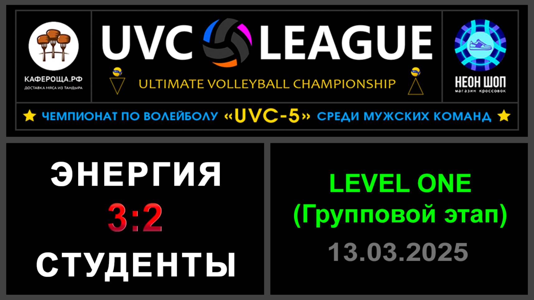 UVC-5 (Мужчины): Чемпионат UVC Лиги по волейболу среди мужских команд, 2024-2025 гг. Результаты игры: LEVEL ONE (Групповой этап) 13.03.2025 Энергия - Студенты 3:2 (18:25, 21:25, 25:19, 25:16, 17:15) Это был уникальный камбэк от Энергии, которая отыгралась с 0:2 по партиям и с 3:10 по очкам на тей-бреке! 👏👏👏 ✅Установлен новый рекорд лиги: супер камбэк на тай-брейке - 3:10! Обе команды продолжат борьбу в LEVEL HOPE, LEVEL ONE для них завершился. #UVC_ЛИГА_ЧЕМПИОНАТ_UVC_5_Мужчины