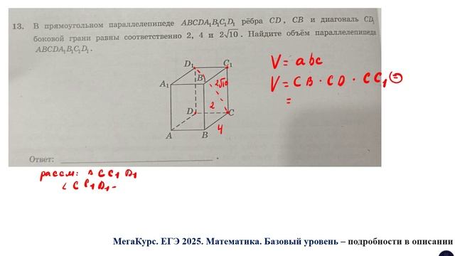 Задание 13. В прямоугольном параллелепипеде ABCDA1B1C1D1 ребра CD, CB и диагональ CD1 боковой грани равны соответственно ... Найдите объём параллелепипеда ABCDA1B1C1D1. Курс по всем заданиям 1 - 21 базового уровня ЕГЭ по математике: https://stepik.org/a/174709 Группа ВК: https://vk.com/secretroom2023 #егэ #математика #база