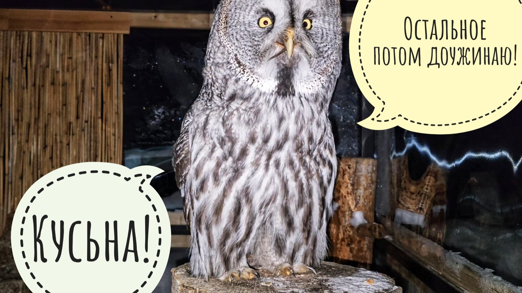 Сова бородатая неясыть Кофи крадётся к мыши и вдумчиво её ужинает