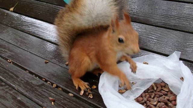 Белка сначала осторожничает, а потом входит во вкус