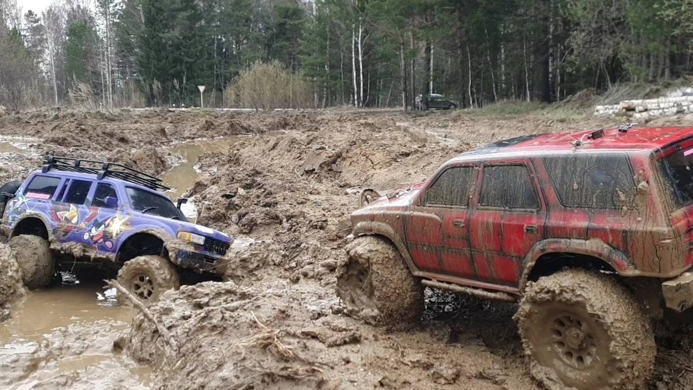 Две радиоуправляемые Тойоты (Land Cruiser 80, 4Runner) едут по тяжелому бездорожью, помогают друг другу в сложных ситуациях.
