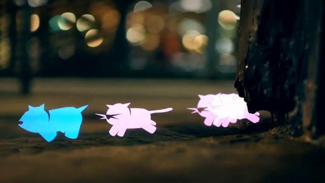 Анимационная работа студии Puhnl, в которой использована комбинация света через трафарет с фотографированием с большой выдержкой. Создателям пришлось потрудиться более 300 часов и использовать более 200 трафаретов, прежде чем картинка ожила. "Если жизнь - это кошачья прогулка, беги как собака" - тема данной анимации.