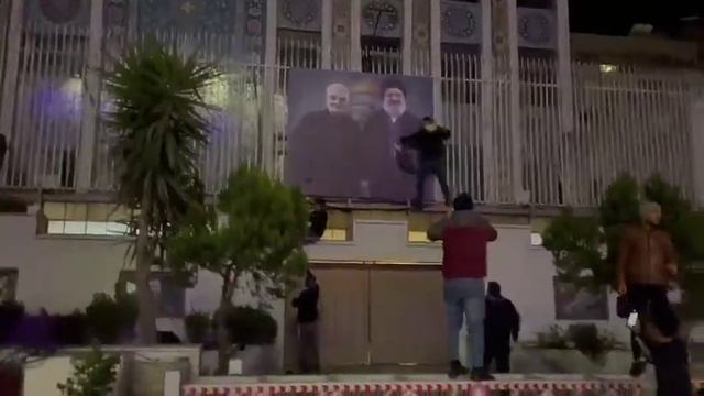 Момент нападения на посольство Ирана в Дамаске: сирийцы разорвали плакат с изображением Насралла
