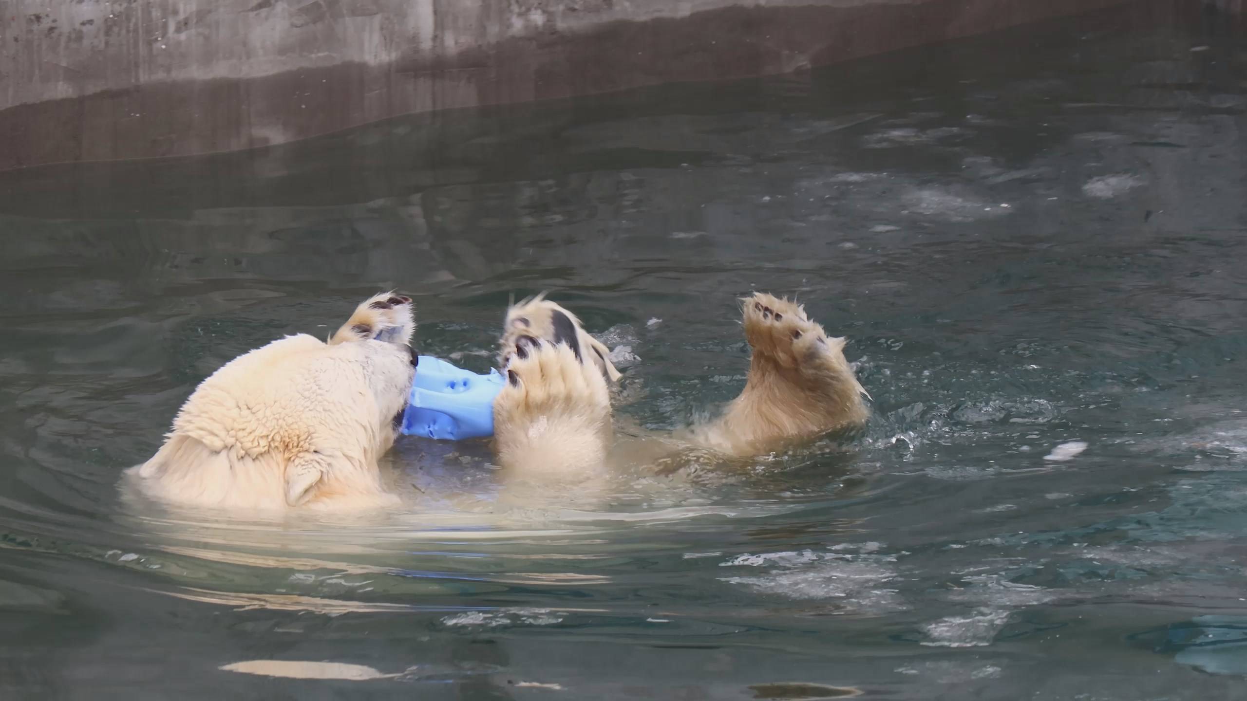 Белый медведь Кай (Красин) родился в Санкт-Петербурге 27 ноября 2007 года. В Новосибирск переехал 20.06.2008. Мама Услада, папа Меньшиков. Герда родилась в Москве 20 ноября 2007 года. Её мама Симона, папа Врангель. В Новосибирск переехала 05.08.2008. В 2013 году у Герды и Кая родилась Шилка. В 2015 году она переехала в Японию. В 2015 году родился Ростик. 6 декабря 2018 года он переехал в Китай. В 2018 году родились Норди и Шайна. 1 6 декабря 2022 года Герда родила 2-х медвежат. И это две девочки! Имена дали 25 июня. Медвежат зовут Стрелка и Белка. Белые медведи одиночные животные. Как правило, миролюбивы по отношению друг к другу, но между самцами в брачный период случаются стычки. Взрослые самцы могут нападать на медвежат. Гон с марта по июнь. Продолжительность жизни — максимум 25—30 лет; в неволе рекорд долгожительства — 42 года. Вес очень крупных самцов в некоторых частях ареала 700 и даже 800 кг: есть данные о зверях весом до 1000 кг. Обычно вес меньше. Самки всегда не только меньше, но и значительно легче самцов. Так, самцы в восточной Гренландии в состоянии нормальной упитанности весят 400—450 кг, хорошо упитанные — до 500 кг, самки, даже очень сытые, здесь же редко весят больше 350—380 кг, т. е. их вес составляет около 75% веса самцов. Длина тела на 3-й день после рождения 28—32 см, средний вес — около 755 г (650—840 г). На 26-й день длина тела увеличивается незначительно — до 35—38 см, а вес возрастает до 1125—1275 г. В возрасте 60 дней самцы весят около 7 кг, самки — около 6 кг при длине тела у первых 58—60 см, у вторых 54—58 см. В возрасте 4 месяца медвежата достигают веса 22—23 кг, в 6-месячном возрасте при длине около 110 см — 40—43 кг, в 8-месячном — 58—62 кг. Длина тела в возрасте с 6 до 9 месяцев нарастает по 6—7 см в месяц. Во время зимнего сна рост почти прекращается. В зоопарке медведей кормят утром морской рыбой, хлеб с рыбьим жиром внутри, морковь, яблоки, морская капуста, яйцо дают сырое. Медвежат подкармливают молоком из соски. На ужин мясо (говядина, конина, куры или индейка). Летом и осенью арбузы, дыни, ранетки, кабачки, тыквы, огурцы. Когда показательное кормление летом бросают живую рыбу.
