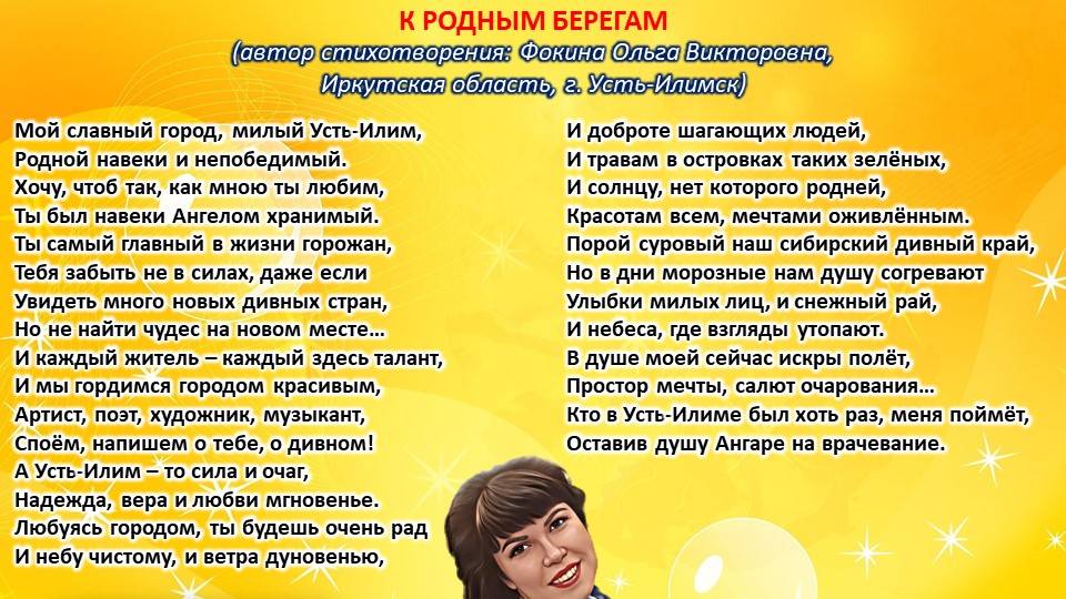 Читает автор стихотворения: ФОКИНА ОЛЬГА ВИКТОРОВНА (Иркутская область, город Усть-Илимск) СТИХИ: https://stihi.ru/2018/07/08/3790 БИОГРАФИЯ: http://www.proza.ru/2019/10/08/1473 ВЫИГРЫВАЙТЕ КНИГИ БЕСПЛАТНО: https://proza.ru/2017/09/17/447 ОТЗЫВЫ ЧИТАТЕЛЕЙ: http://www.proza.ru/2019/11/29/611 Из книги Фокиной Ольги Викторовны (Усть-Илимск) «Несу добро в ладошках!»: [все стихотворения с 2005 по октябрь 2020 гг., проза, авторские песни, интервью]. – Москва: МГО Союза писателей России, 2020 г. – 886 стр., ил. ISBN 978-5-7949-0826-8 К РОДНЫМ БЕРЕГАМ (автор стихотворения: Фокина Ольга Викторовна, Иркутская область, г. Усть-Илимск) Мой славный город, милый Усть-Илим, Родной навеки и непобедимый. Хочу, чтоб так, как мною ты любим, Ты был навеки Ангелом хранимый. Ты самый главный в жизни горожан, Тебя забыть не в силах, даже если Увидеть много новых дивных стран, Но не найти чудес на новом месте… И каждый житель – каждый здесь талант, И мы гордимся городом красивым, Артист, поэт, художник, музыкант, Споём, напишем о тебе, о дивном! А Усть-Илим – то сила и очаг, Надежда, вера и любви мгновенье. Любуясь городом, ты будешь очень рад И небу чистому, и ветра дуновенью, И доброте шагающих людей, И травам в островках таких зелёных, И солнцу, нет которого родней, Красотам всем, мечтами оживлённым. Порой суровый наш сибирский дивный край, Но в дни морозные нам душу согревают Улыбки милых лиц, и снежный рай, И небеса, где взгляды утопают. В душе моей сейчас искры полёт, Простор мечты, салют очарования… Кто в Усть-Илиме был хоть раз, меня поймёт, Оставив душу Ангаре на врачевание. 23 июня 2016 г. Стихотворение зарегистрировано на авторские права, поэтому его цитирование возможно только с указанием полного авторства: Фокина Ольга Викторовна (г. Усть-Илимск)