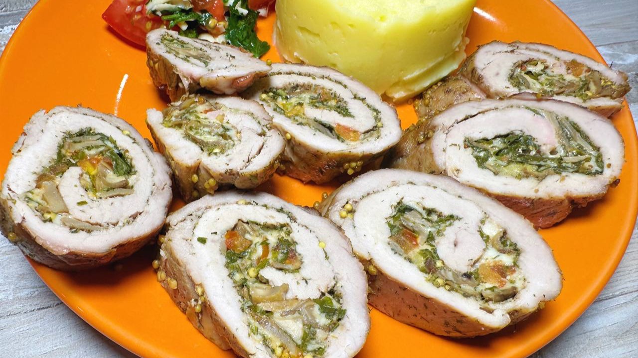 Рулет из вырезки ✔️ Вырезка свинины - 300 гр ✔️ Грибы - 100 гр ✔️ Петрушка - много ✔️ Помидор - 1 шт ✔️ Сыр - 50 гр ✔️ Чеснок - 2 зубчика ✔️ Масло - 1 ч ложка ✔️ Соевый соус - 1 ч ложка ✔️ Соль, специи - по вкусу Намазка ✔️ Горчица зернистая - 2 ч ложки ✔️ Соевый соус - 2 ч ложки ✔️ Масло - 1 ч ложка ✔️ Ароматные травы - 1 ч ложка ✔️ Соль, специи- по вкусу