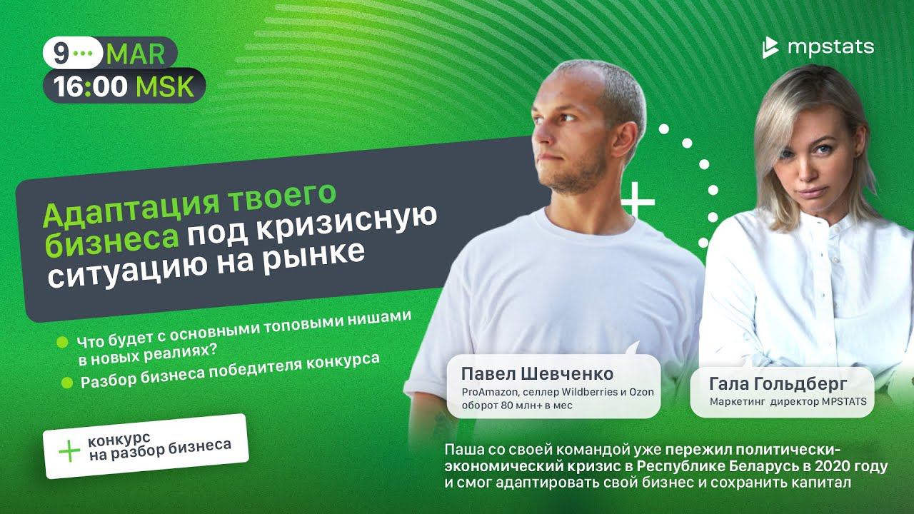 Сегодня тебя ждет: Павел разберет несколько популярных ниш на маркетплейсах, и расскажет, какие изменения их ждут в ближайшее время Подробный разбор бизнеса одного из слушателей в прямом эфире Ответы на вопросы из чата Это уже вторая антикризисная встреча сервиса аналитики MPSTATS и Павла Шевченко. На первой мы затронули основные аспекты: закупка, юнит-экономика и продажи Смотри эфир здесь https://www.youtube.com/watch?v=1Gf2X0B-e_0&t=1s Спикеры: — Павел Шевченко, ProAmazon, селлер Wildberries и Ozon оборот 80 млн+ в мес — Гала Гольдберг, маркетинг директор MPSTATS Запишись на демонстрацию сервиса аналитики маркетплейсов MPSTATS и попробуй его бесплатно ⇢ https://clck.ru/akcdq ✅ Интересует полное или точечное сопровождение на маркетплейсах? Ты можешь выбрать SEO-оптимизацию карточек, ведение ЛК или аудит твоего бренда⚡️ Заполни форму для связи с менеджером, и он ответит на любые твои вопросы ⇢ https://clck.ru/aoFkK ✅Узнай больше о возможностях сервиса: В чат-боте ⇢ http://mpstats.me/?utm_source=youtube На сайте ⇢ http://mpstats.io/?utm_source=youtube А ещё тебя ждёт Крупнейший форум страны по маркетплейсам MPSTATS CONF 2022 30 и 31 марта. Более 1.500 участников в офлайн и еще более 10.000 в онлайн объединятся и встретят ТОПовых продавцов главных маркетплейсов России: Wildberries, Ozon, AliExpress, YandexMarket и SberMegaMarket Переходи, чтобы узнать подробности и выбрать билет https://clck.ru/cQ3dr ✅Подписывайся на наши соцсети и будь в курсе всех новостей и обновлений: Мы в VK ⇢ https://vk.com/mpstatsio Наш Instagram ⇢ https://www.instagram.com/mpstats.io/ Telegram-канал ⇢ https://telegram.me/analyticsmpstats Facebook ⇢ https://www.facebook.com/mpstats.io/